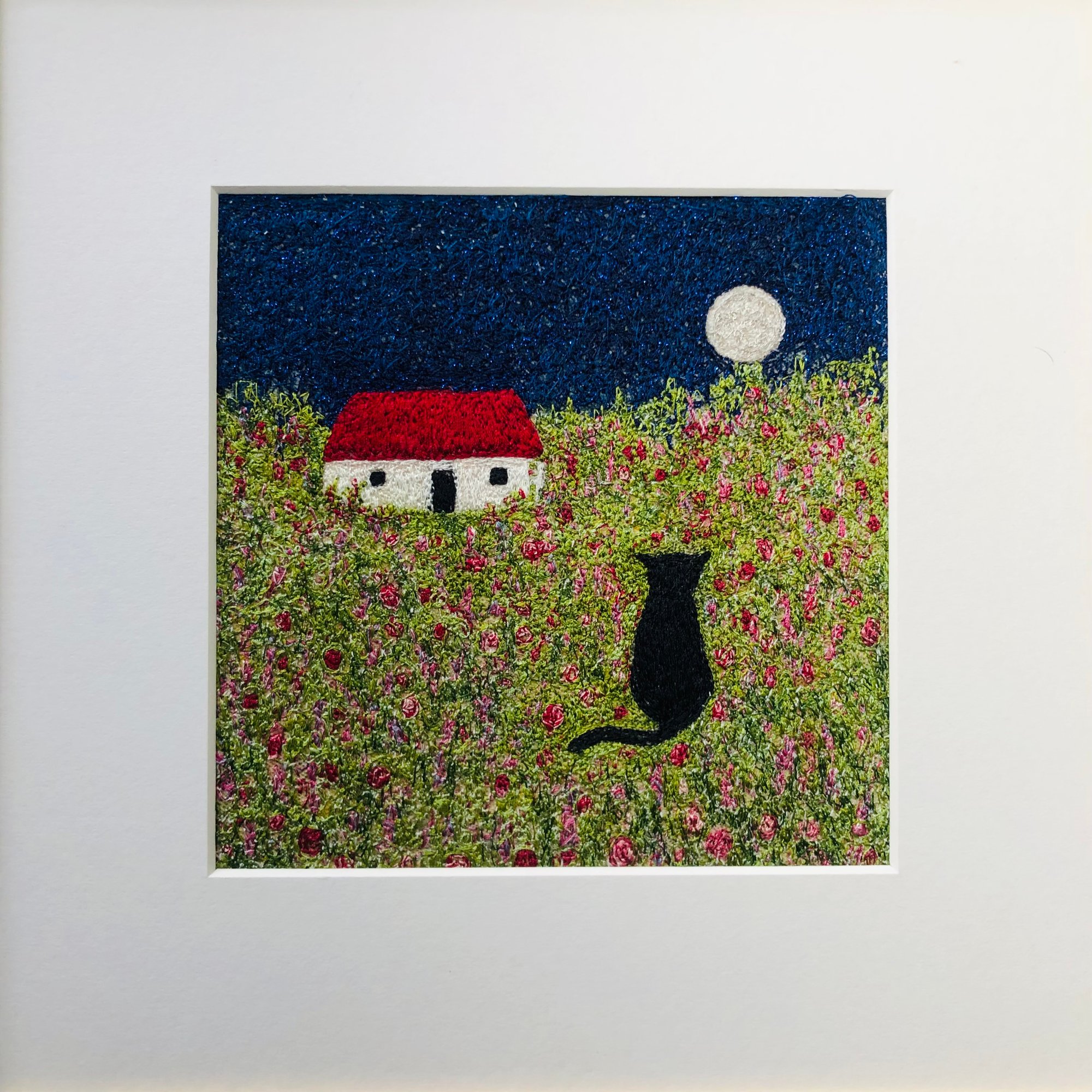 Each unique piece is hand painted on artist canvas before covering with millions of tiny stitches ,using the just the needle,guided by hand on a domestic sewing machine.