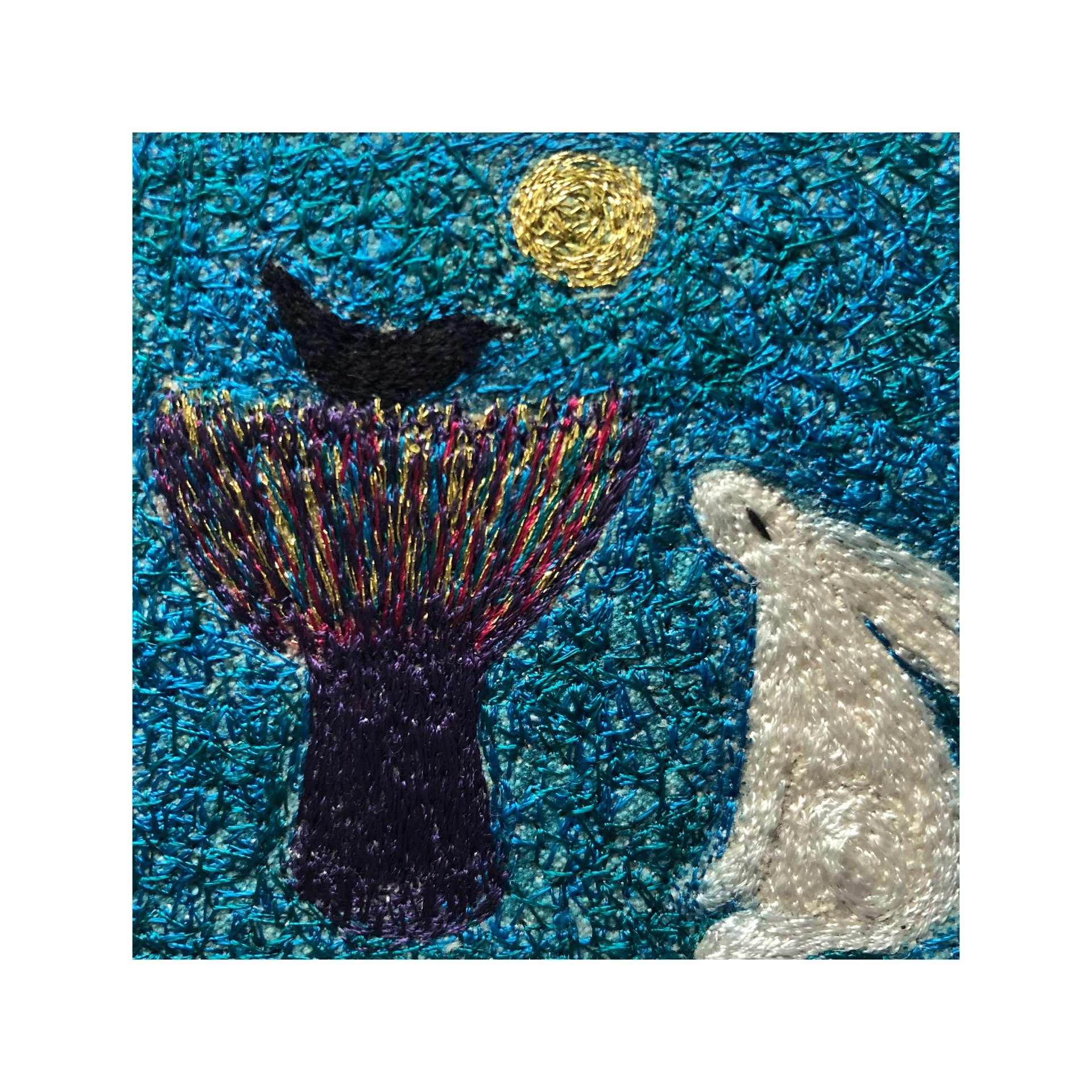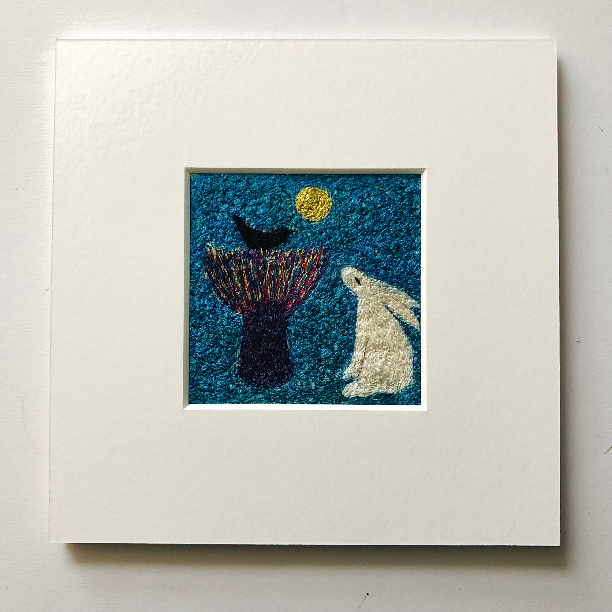 Each unique piece is hand painted on artist canvas before covering with millions of tiny stitches, using the just the needle,guided by hand on a domestic sewing machine.