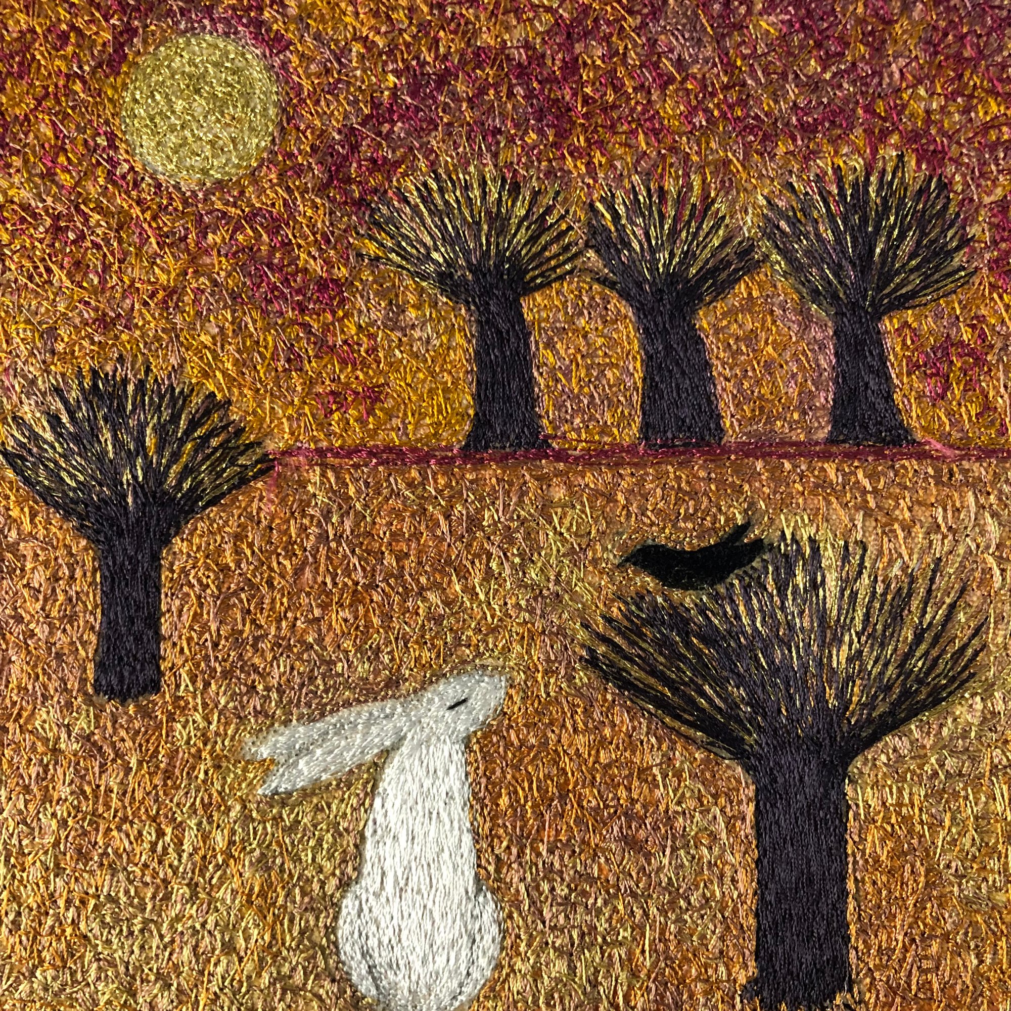 Each unique piece is hand painted on artist canvas before covering with millions of tiny stitches ,using the just the needle,guided by hand on a domestic sewing machine.