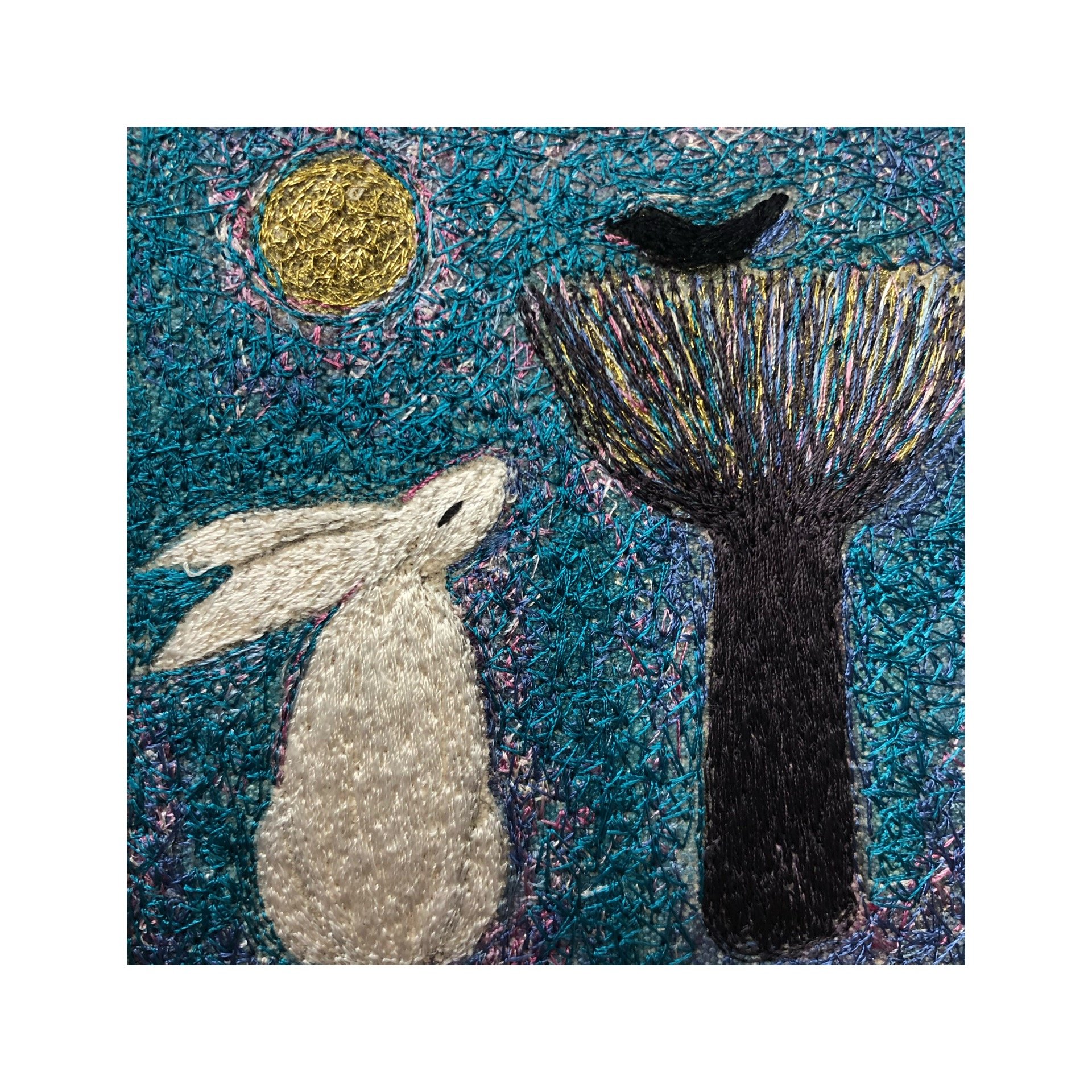 Each unique piece is hand painted on artist canvas before covering with millions of tiny stitches ,using the just the needle, guided by hand on a domestic sewing machine.