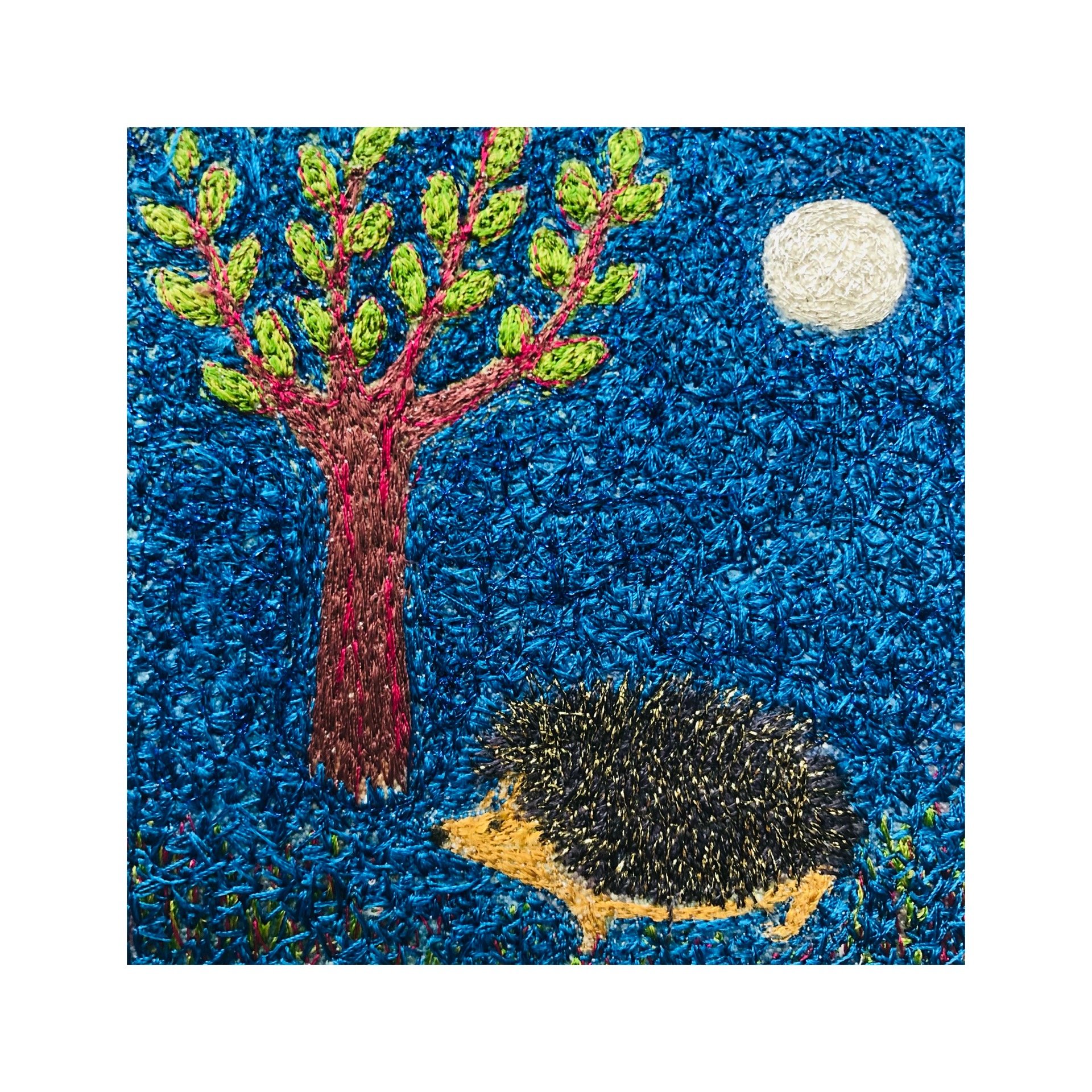 Each unique piece is hand painted on artist canvas before covering with millions of tiny stitches ,using the just the needle, guided by hand on a domestic sewing machine.