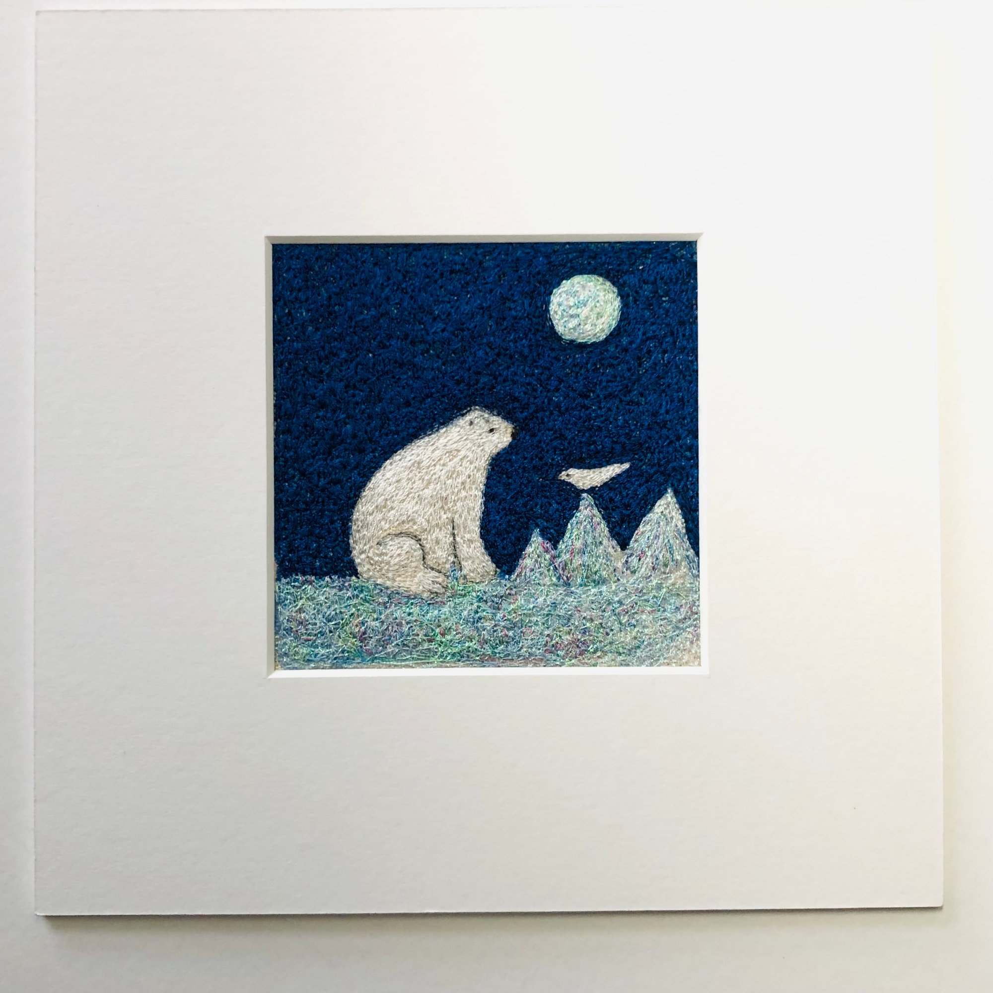 Handmade embroidery (4 inch x 4 inch) in a white mount with backing card, ready to fit a standard 8 inch x 8 inch frame of your own choosing or alternatively display on a shelf in its mount.