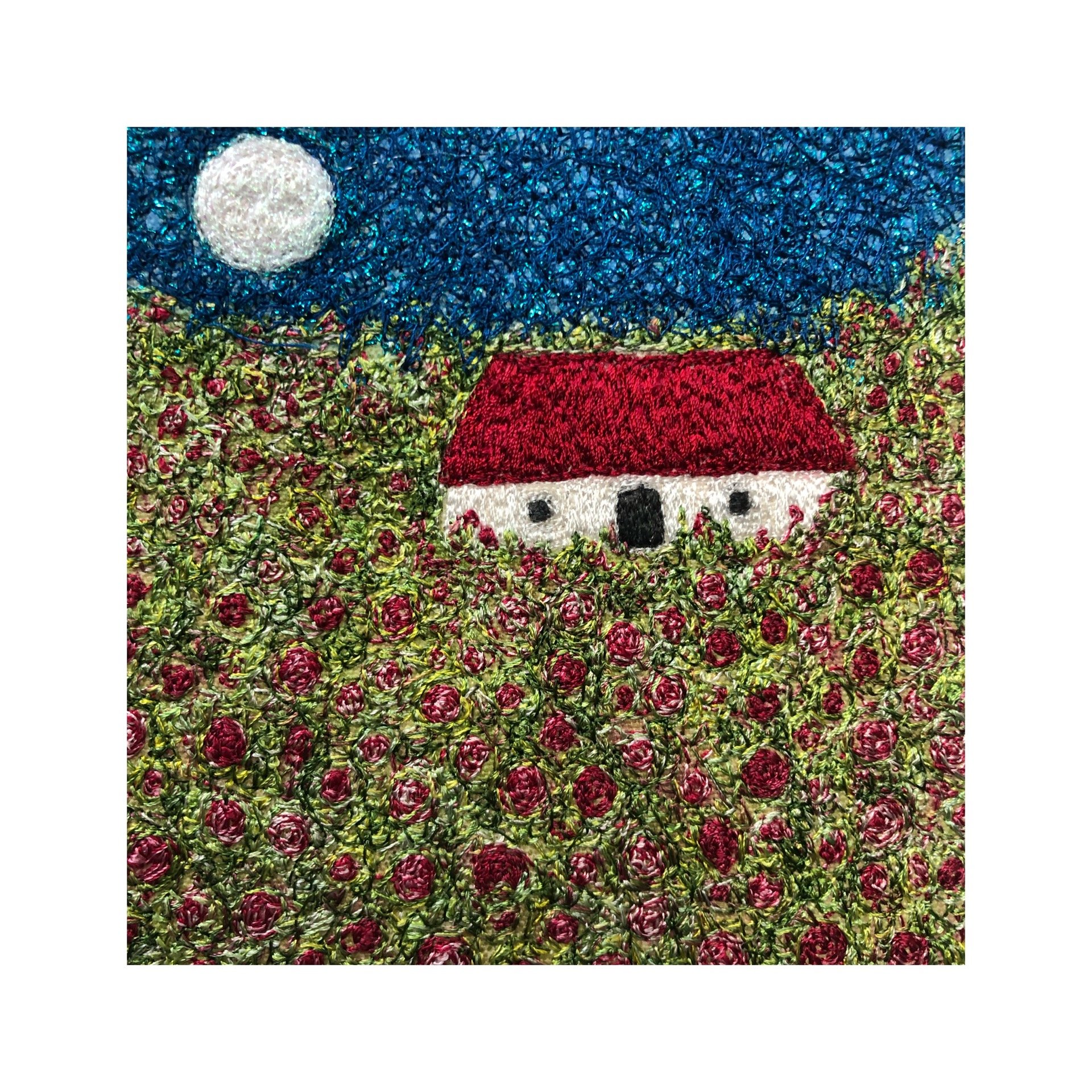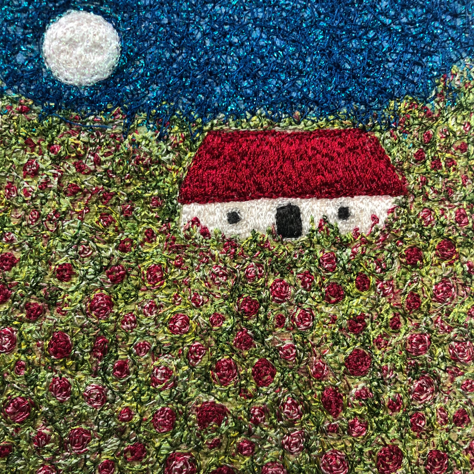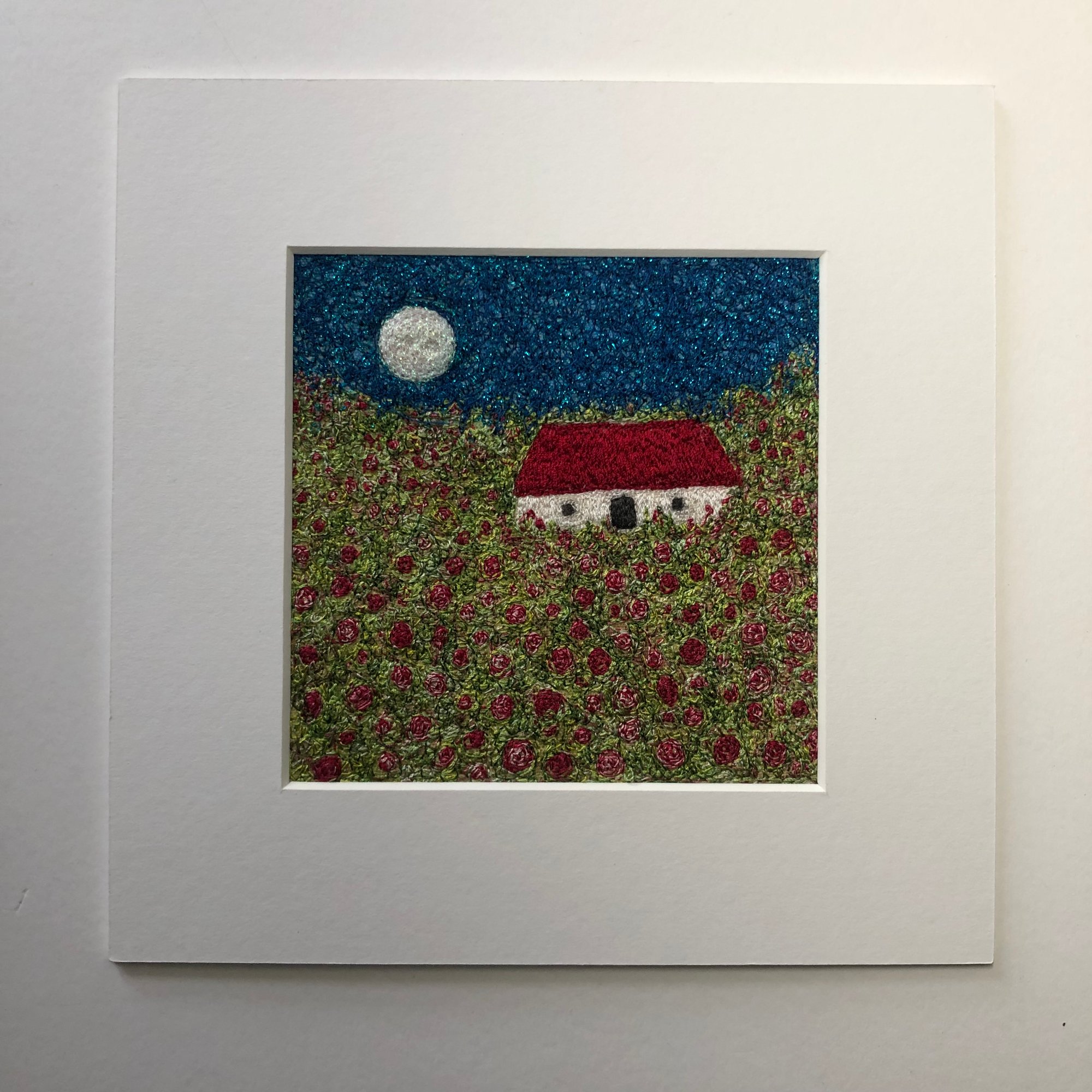 Each unique piece is hand painted on artist canvas before covering with millions of tiny stitches, using the just the needle, guided by hand on a domestic sewing machine.