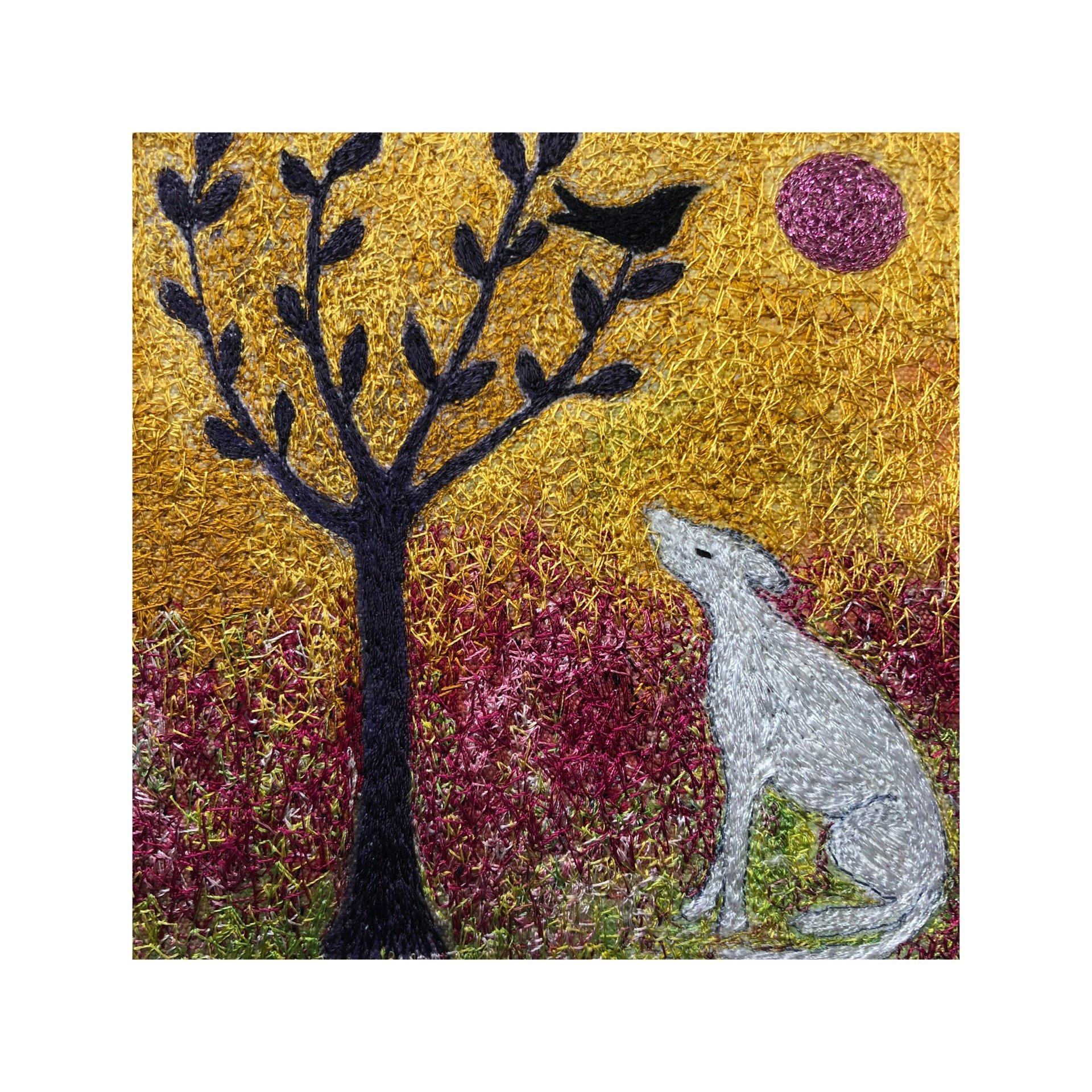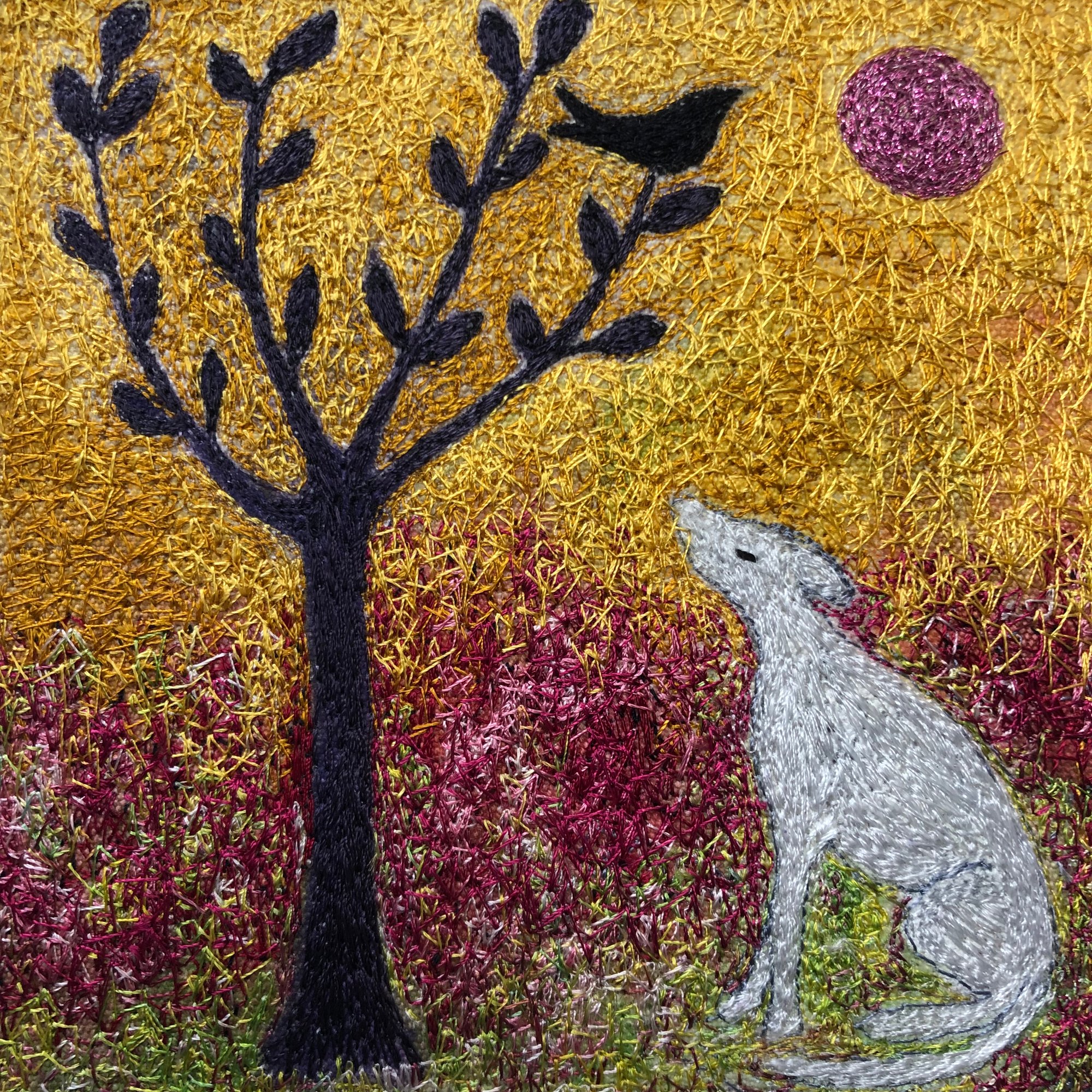 Each unique piece is hand painted on artist canvas before covering with millions of tiny stitches, using the just the needle, guided by hand on a domestic sewing machine.
